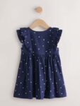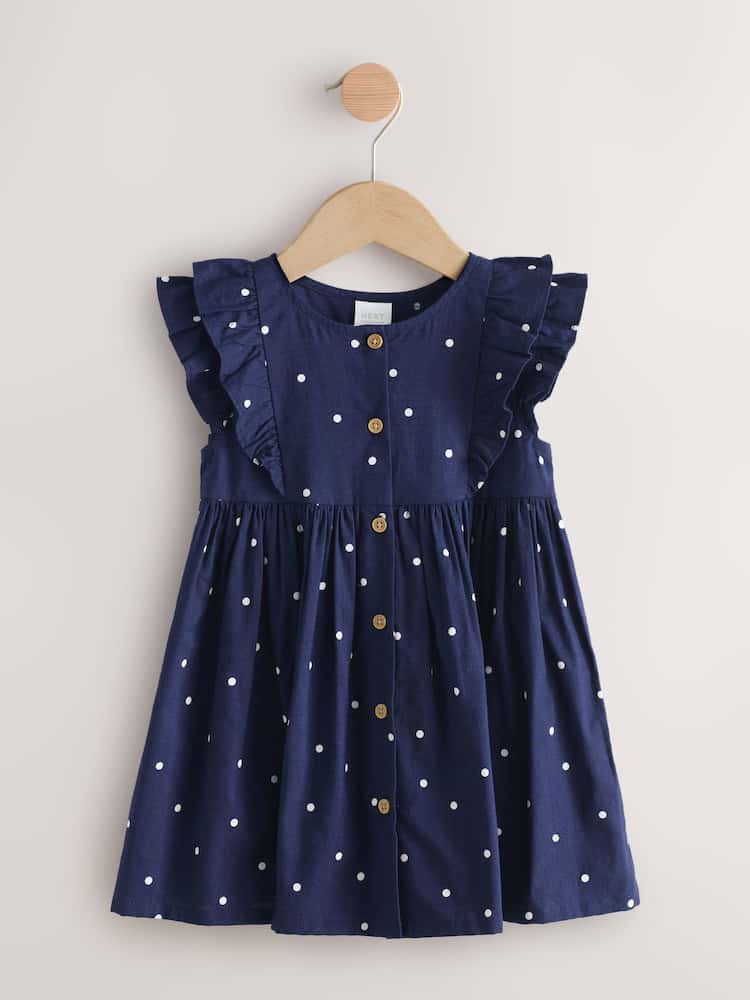 This delightful Navy Double Ruffle Sleeve Dress is the perfect beautiful dress for warmer months for your little one. Crafted from soft, breathable cotton fabric with spots, it ensures comfort for all-day adventures. It features a charming pretty double frill detail on the sleeves and a practical buttonthrough front, blending playful style with easy dressing.