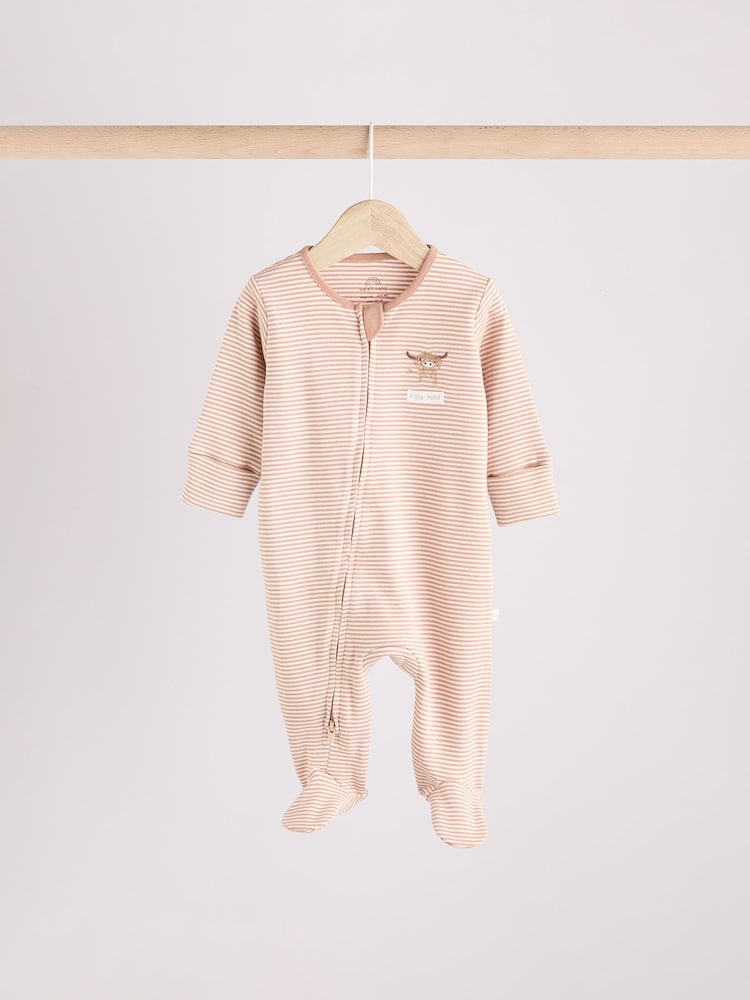 This 3-pack of sleepsuits are the perfect way to add some fun to their bedtime routine, featuring our Hamish the Highland Cow as a printed graphic, set against plain and striped cotton bases, turn-back scratch mitts up to 3-6 months, inner lined feet and an anti-slip sole print from 9-12 months.