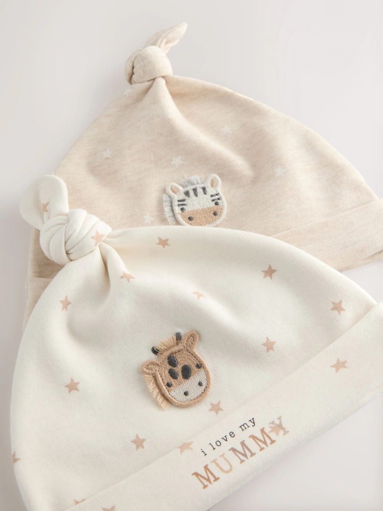 This 2-pack of baby hats feature an adorable ‘I love my Mummy’ and ‘I love my Daddy’ slogan with an embroidered zebra and giraffe design, an all-over print and a tie top, made from pure cotton.