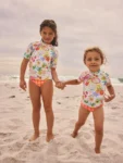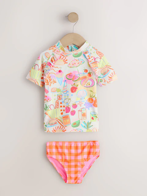 Prepare your little one for sunny adventures with the Orange Picnic Scene Short Sleeved Frill Sunsafe Set, an adorable and practical choice that is perfect for holiday. This vibrant two-piece set features a short-sleeved top adorned with a whimsical picnic scene print and sweet frill detailing, paired with coordinating orange gingham check bottoms.