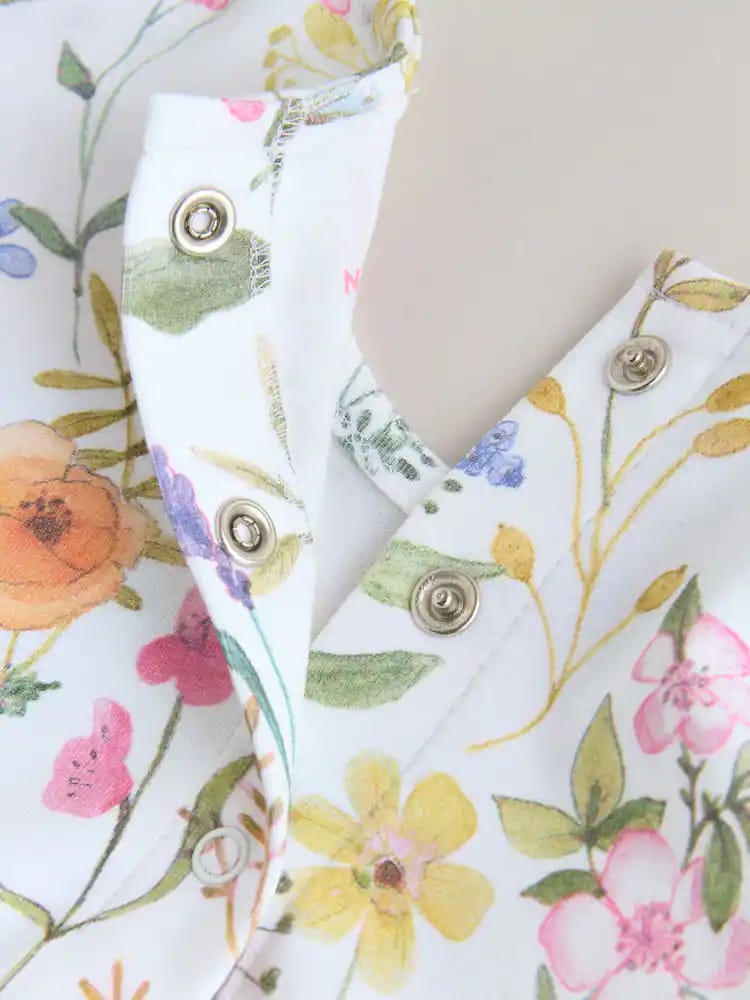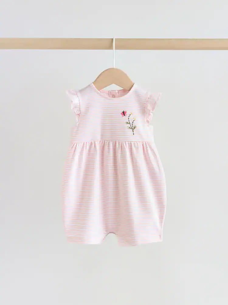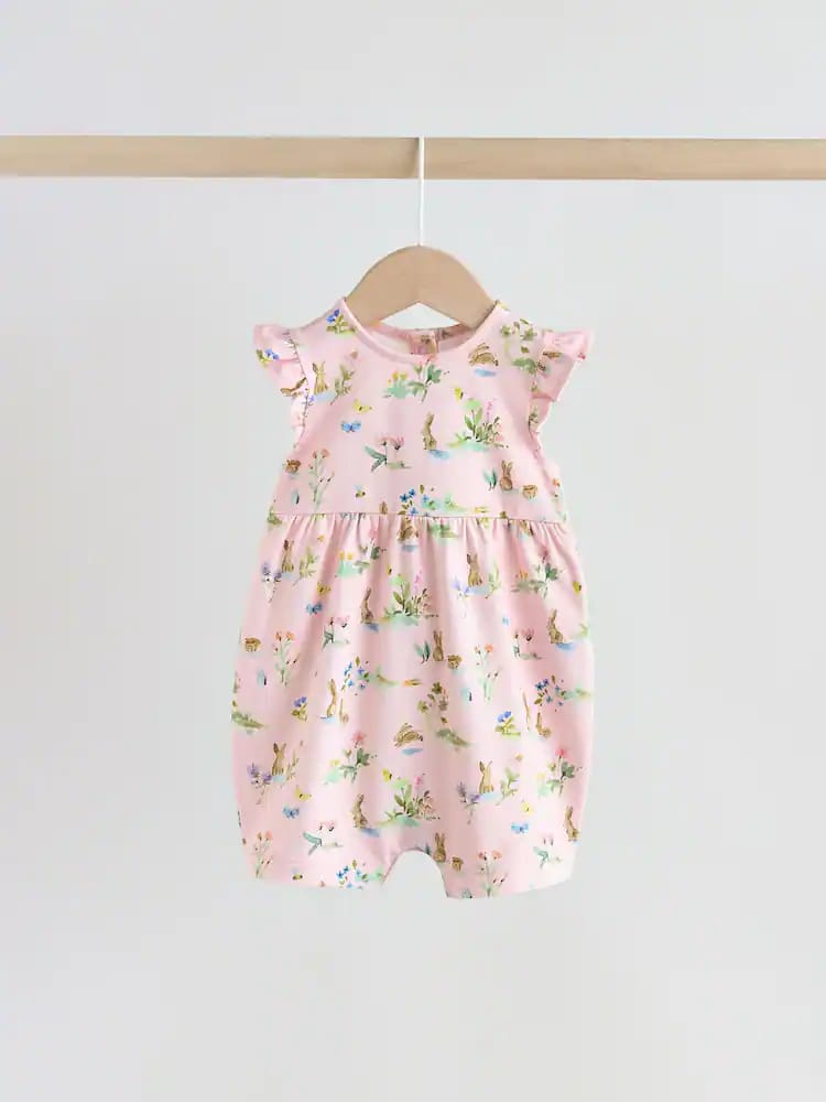 This sweet Printed Rompers 3 Pack is a charming collection of warm-weather outfits. The rompers feature a fun printed design and playful frill shoulder detail. The designs include a wadded character detail on one of the rompers, and all feature a convenient popper back neck and popper leg opening for easy changing.