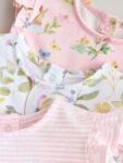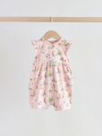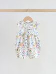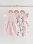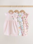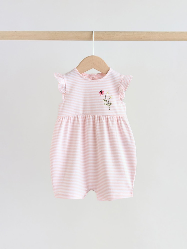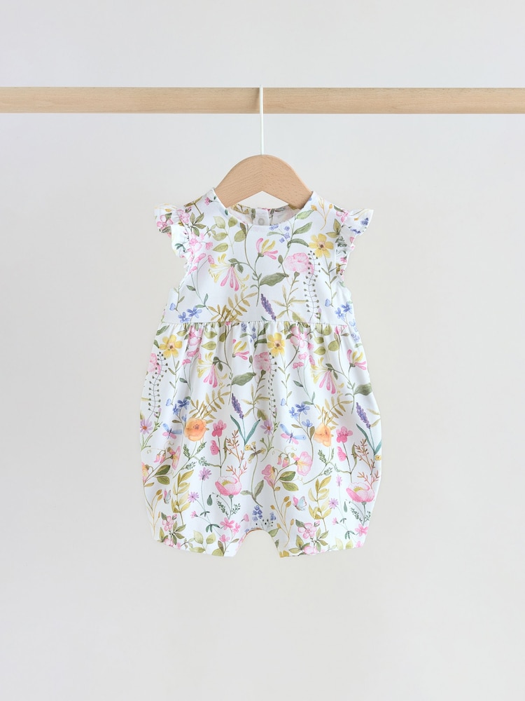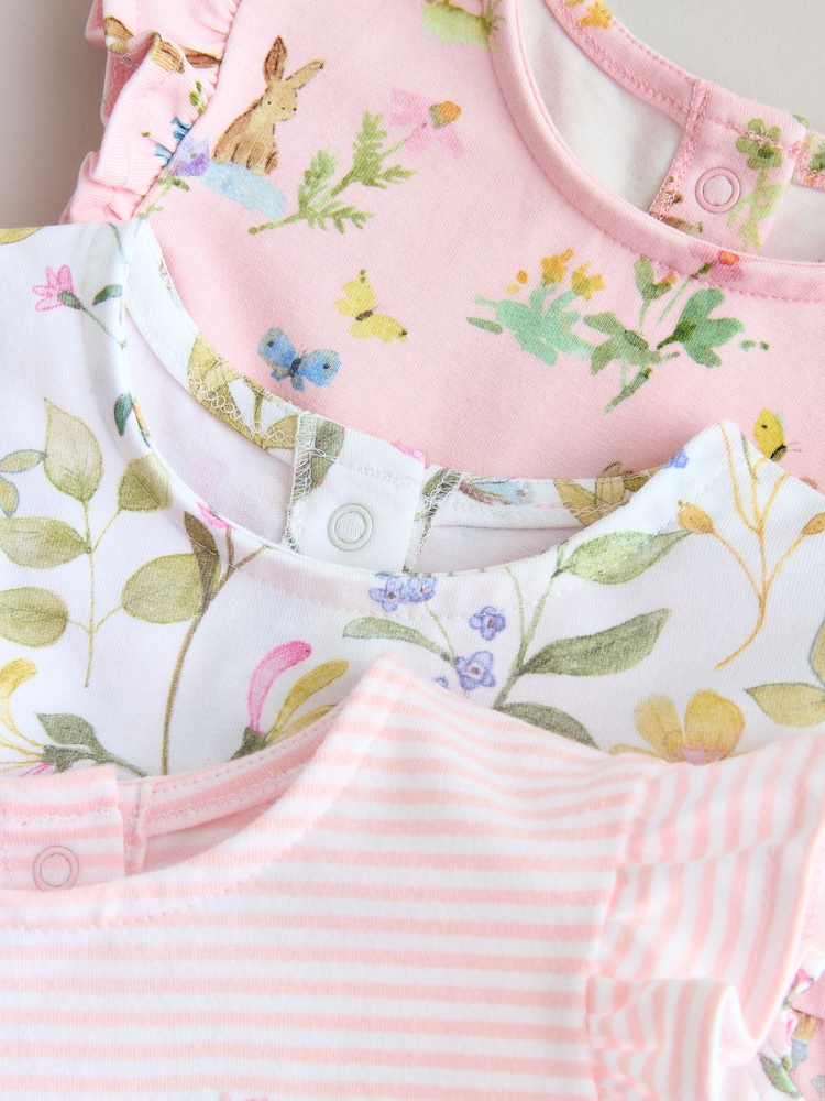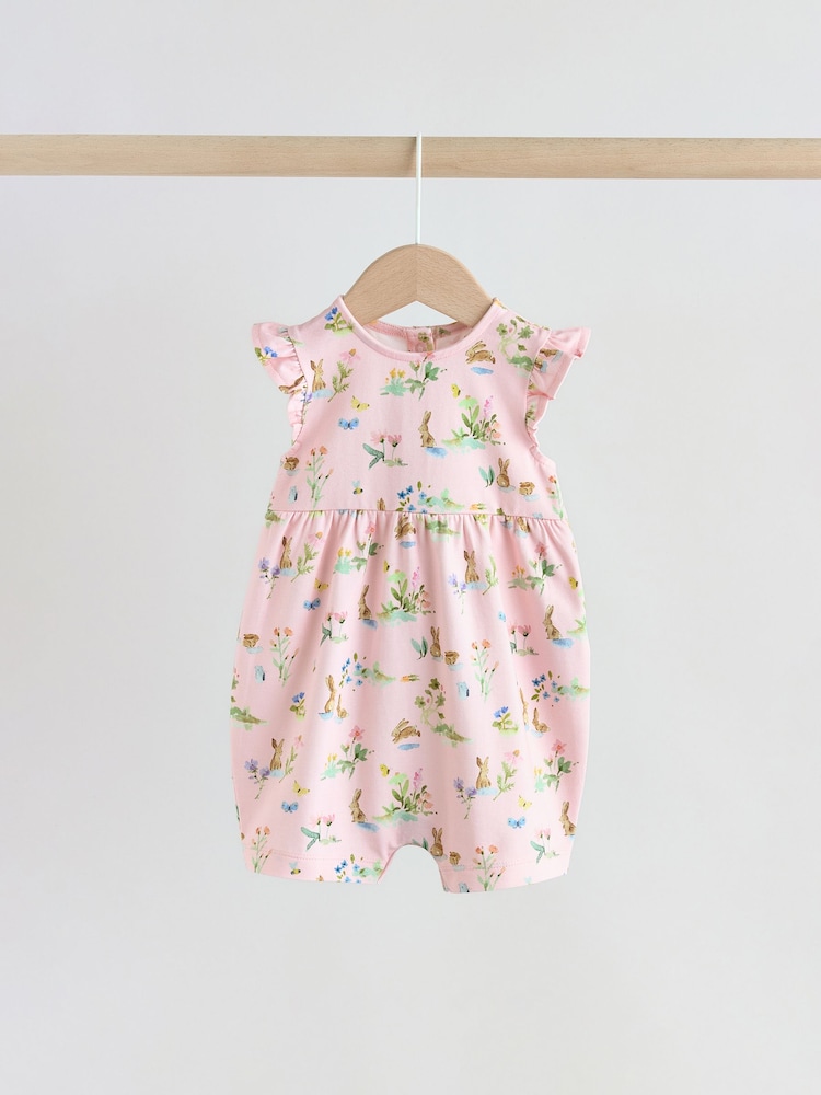 This sweet Printed Rompers 3 Pack is a charming collection of warm-weather outfits. The rompers feature a fun printed design and playful frill shoulder detail. The designs include a wadded character detail on one of the rompers, and all feature a convenient popper back neck and popper leg opening for easy changing.