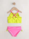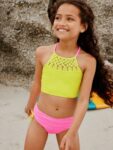 Macrame detailing on the lime green high-neck top adds a unique, handcrafted look.