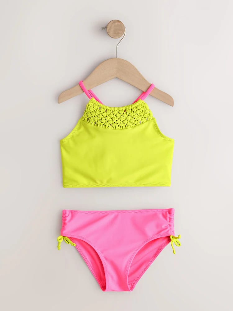 This Pink/Lime Macrame Bikini is a vibrant and stylish two-piece set that is perfect for holiday adventures. Crafted from a soft stretchy fabric, it ensures a comfortable fit for all-day wear at the beach or pool.