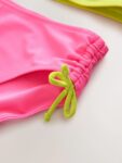 Vibrant pink bikini bottoms include ruched side detailing with lime green tie accents.