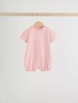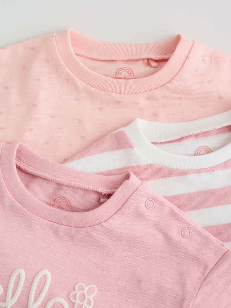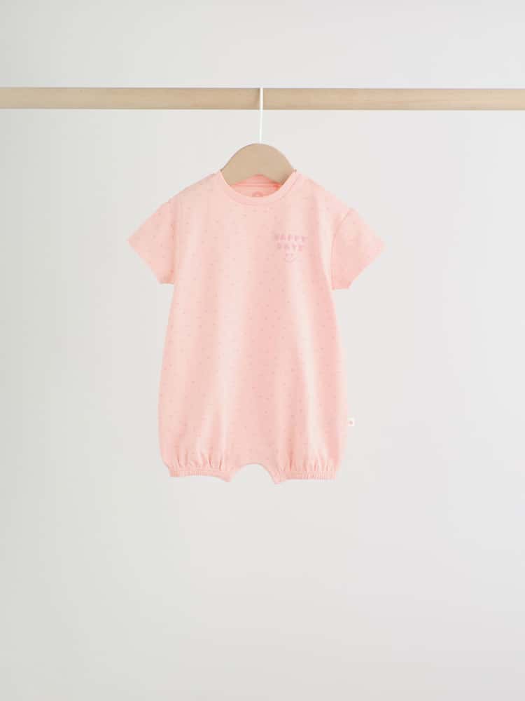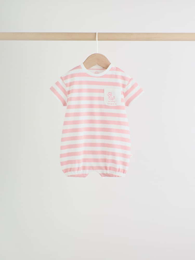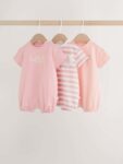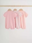 This set of 3 short-sleeved jersey rompers include a mix of prints and stripe designs. Features popper fastening for easy changing.