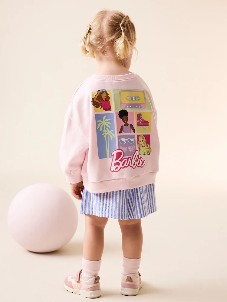 This fun Pink Barbie Shorts Set is a cute casual outfit for her wardrobe. The set features a brush back sweat top with a large Barbie graphic print on the back. The coordinating striped shorts have charming love heart pockets detail and a small Barbie logo embroidery.