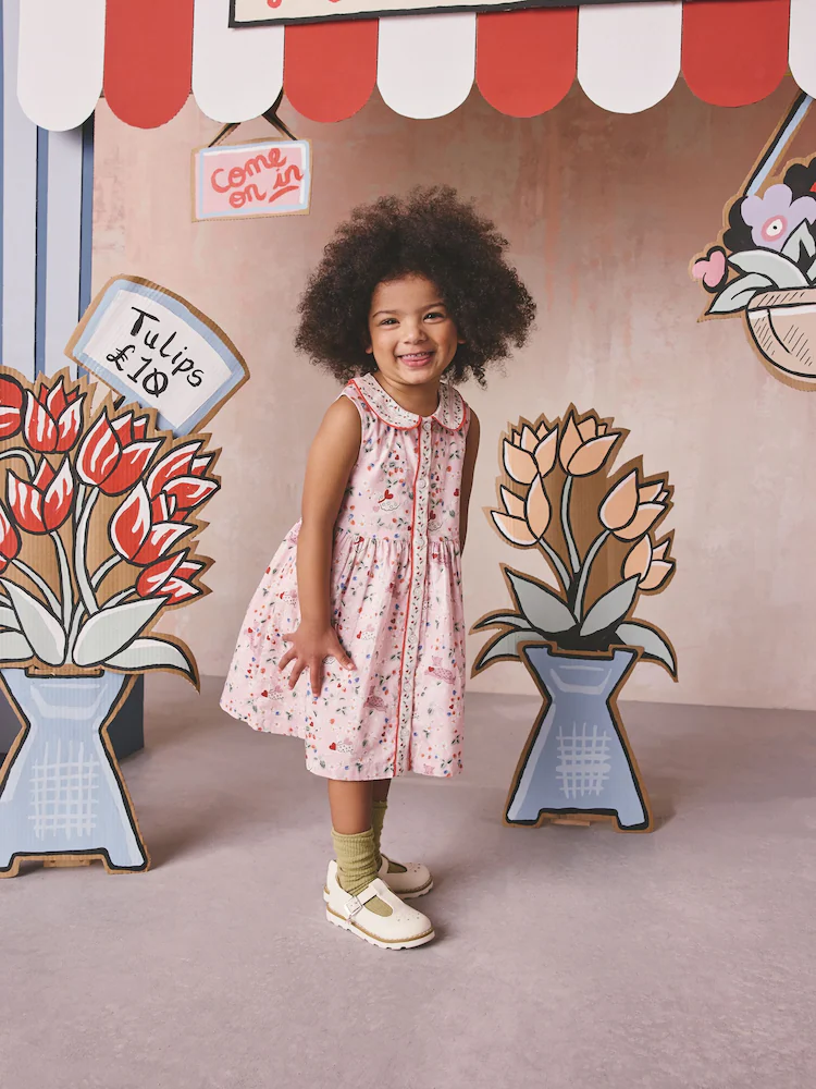 This pink Cath Kidston dress is crafted from soft cotton fabric and features a charming all-over ditsy floral and heart print. Designed with a classic sleeveless silhouette, it includes pretty original artwork and traditional tailoring details.