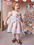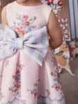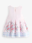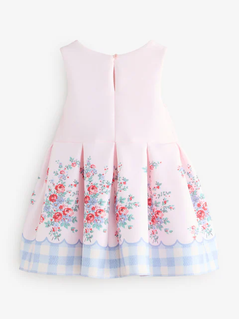 This pink scuba dress features a mixed print design by Cath Kidston, combining vibrant floral patterns with blue and white gingham accents. Crafted from soft scuba fabric, it is designed with a sleeveless silhouette and a large 3D bow at the waist.