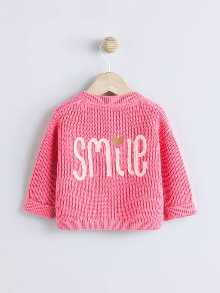 Add some joy to their knitwear collection, with this pure-cotton pink cardigan, decorated with a ‘Smile’ slogan stitched design to the back. A button-up fastening leads to a round collar, finished with pouch pockets and ribbed hems.