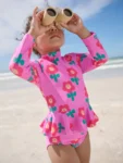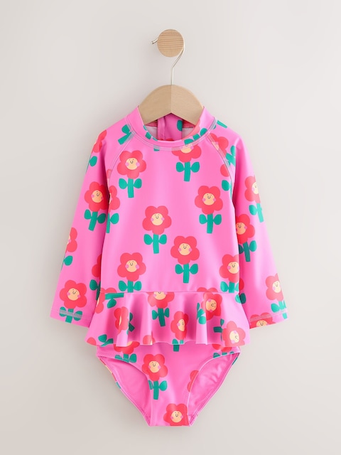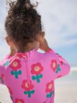 This gorgeous swim set keeps them safe in the sun without sacrificing style, featuring a long sleeve top with a tall neck, a zip fastening up to ages 12-18 months and ruffle detailing, alongside a pair of matching shorts. A UPF rating of 50+ protects against the sun’s rays on covered areas.