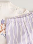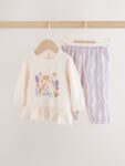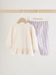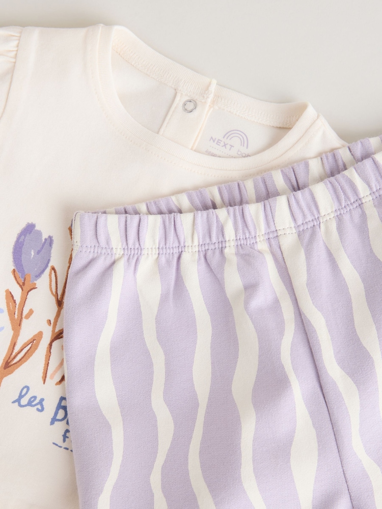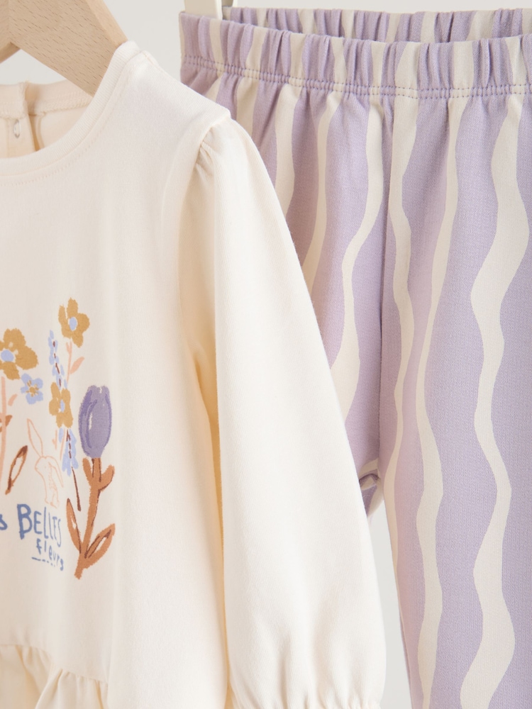 This charming Purple Flower Baby T-Shirts And Trousers 2 Piece Set is a fun and gentle option for your little one. The set includes a short sleeve T-Shirt with mock rolled up sleeves and a pretty floral print, paired with fun wavy stripe elasticated trousers.