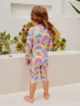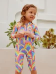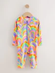 Protect your little one on beach days and sunny holidays with this sunsafe swimsuit, offering extra coverage and made from a fabric with a UPF rating of 50+. This all-in-one has a zip fastening leading to a tall collar, long sleeves and knee-length legs.