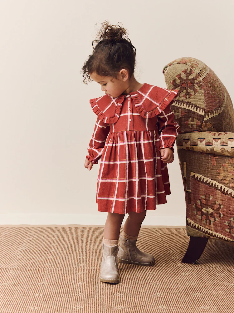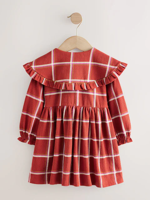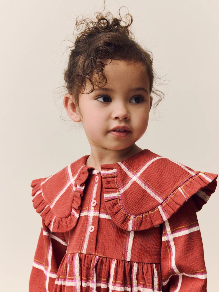 This adorable dress features collared detailing, made from a textured fabric with ruffle trims and a front button fastening, finished with long sleeves.