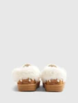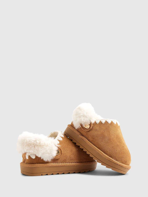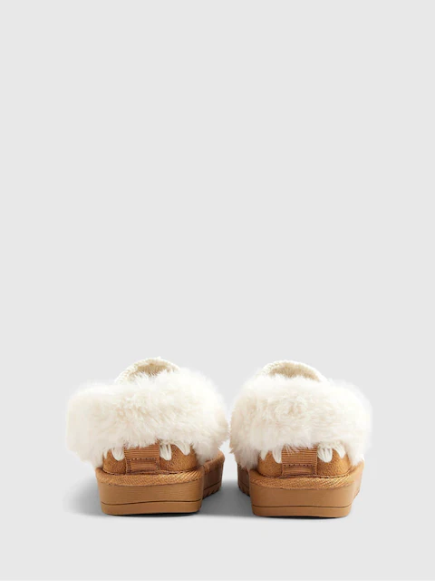 Faux suede fabric Whipstitch trim detail Faux fur lined Strapped Backless Round toe Platform soles
