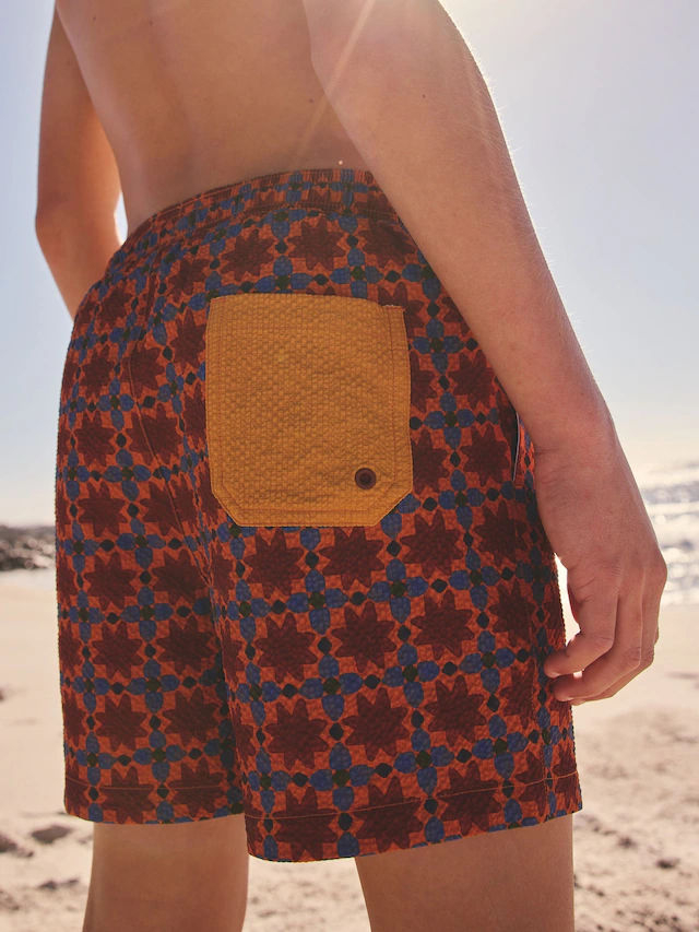 Make a splash with these eye-catching Rust Brown Printed Swim Shorts, perfect for his next beach or pool day. The vibrant print adds a dynamic look, while the practical functional drawcord ensures a secure and adjustable fit. Complete with a soft comfort liner, these shorts offer essential ease and movement for all his swimming adventures.