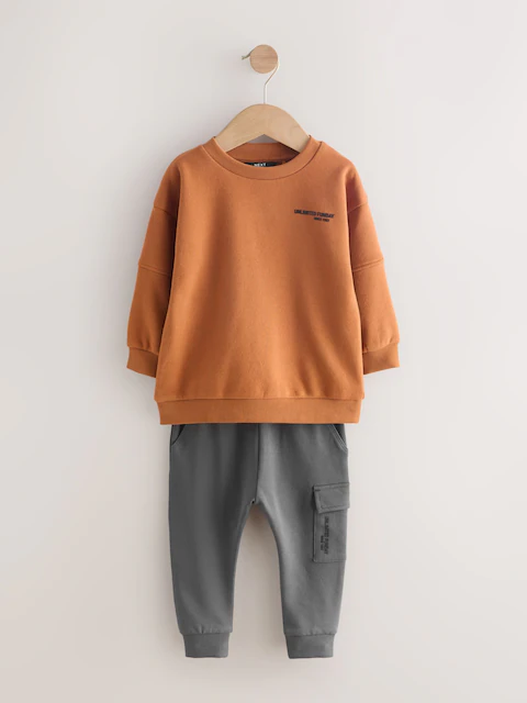 Upgrade his rotation with our khaki/grey utility sweatshirt and super skinny joggers set. In a cotton rich blend, this stylish set includes a grey long sleeve sweatshirt and khaki skinny fit joggers.