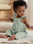 Sweeten their everyday wardrobe with this delightfu jersey romper, adorned with a playful all-over print. Designed for easy dressing, it features ruffed straps and practical poppers at the shoulder and crotch to ensure your little one stays comfortable during playtime.