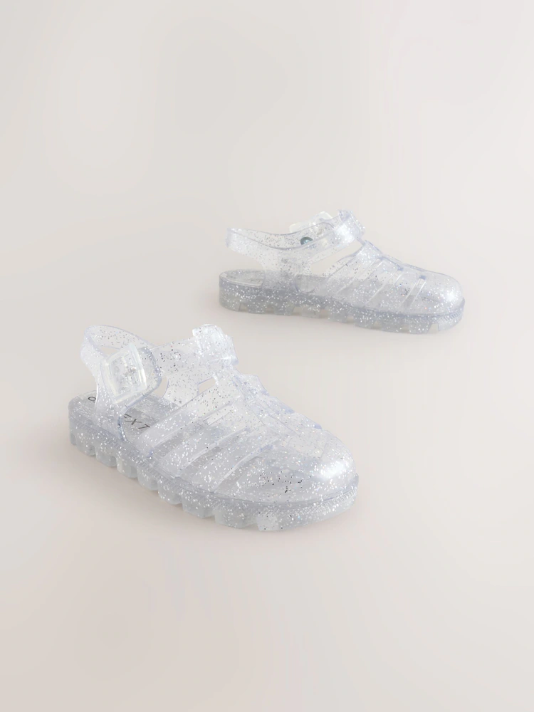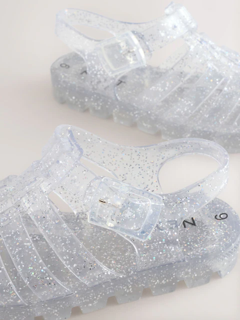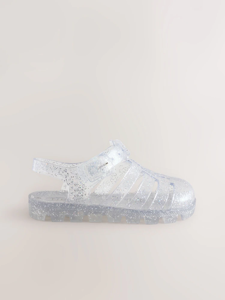 Jelly sandals. Silver-tone glitter. Open-toe design. Buckle fastening.