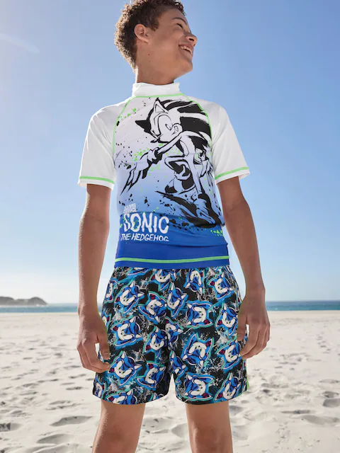 Made from a lightweight and stretchy fabric, keep them safe in the sun with our short sleeve White and Blue Sonic rash vests, with a zip fastening to the neck for ages 2 years and below for easy dressing. The rash vest is available in officially licensed designs of their favourite Sonic the Hedgehog, finished with a protective UPF rating of 50+.