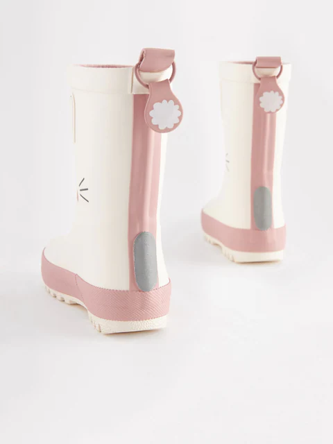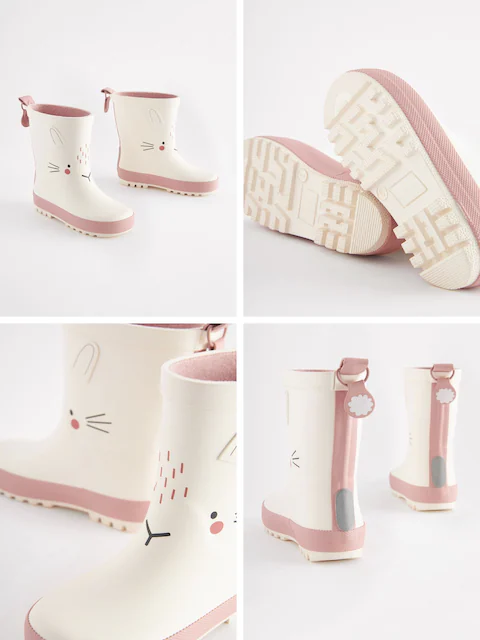 Our white bunny print wellies are the perfect choice for their rainy-day adventures. Sitting just above the ankle, these durable boots are designed with a slip-resistant sole for added grip when it rains. Coated in a cute bunny print design and finely finished with a pull tab for easy wear.