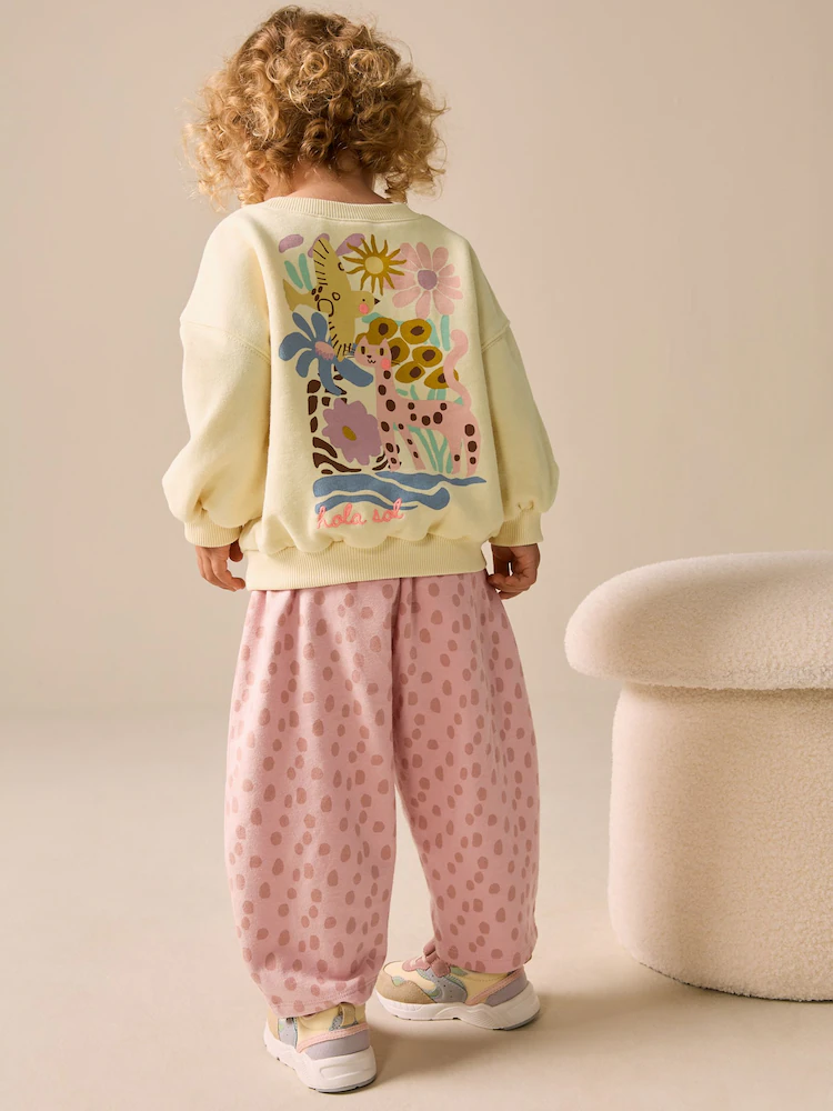 Unleash their playful side with this fun two-piece set. The soft brushed fabric ensures all-day comfort, while the print on the sweatshirt adds interest. Paired with barrel-leg joggers, it’s a stylish and cosy outfit for everyday adventures.