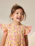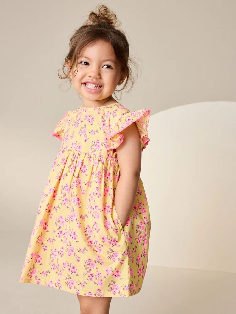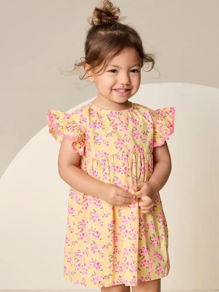 Introduce a charming, classic style with this Pretty Butter Yellow Ditsy Ric Rac Frill Sleeve Dress. Crafted from super cute butter yellow fabric with oink flower prints, this dress is perfect for warm-weather outfitting. It features fun ric rac sleeves and secure buttons at the back for easy dressing, making it a pretty and practical staple.